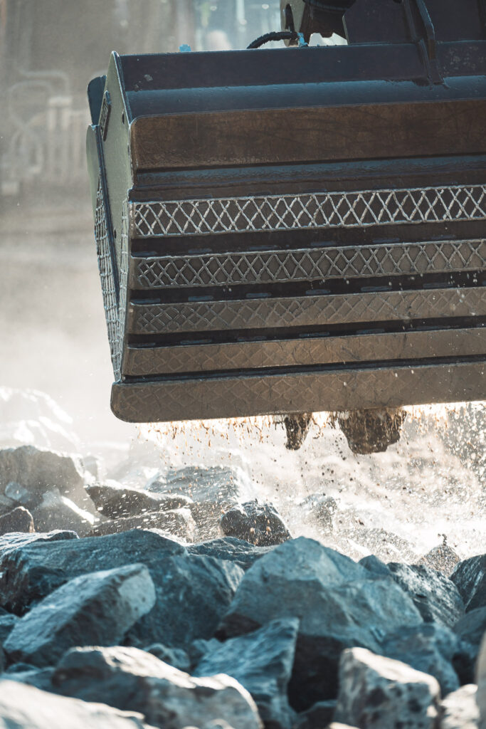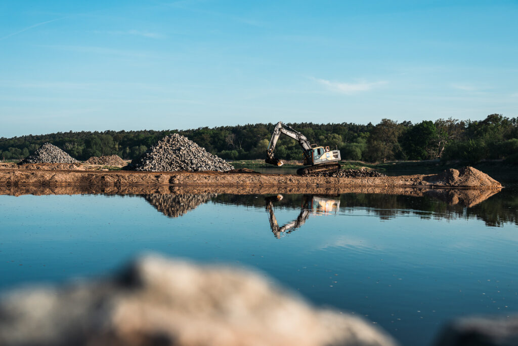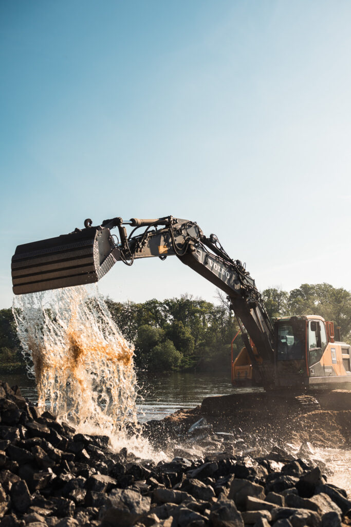 Der Bau von Buhnen wirkt von außen wie schwere Technik im Fluss.